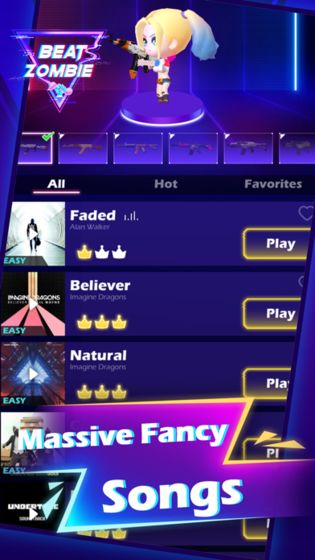 2、丰富歌曲资源:提供满足不同口味的歌曲数量,后续将更新100多首曲目,涵盖多种风格,让玩家在不同旋律中体验节奏与射击结合的乐趣,保持游戏新鲜感。