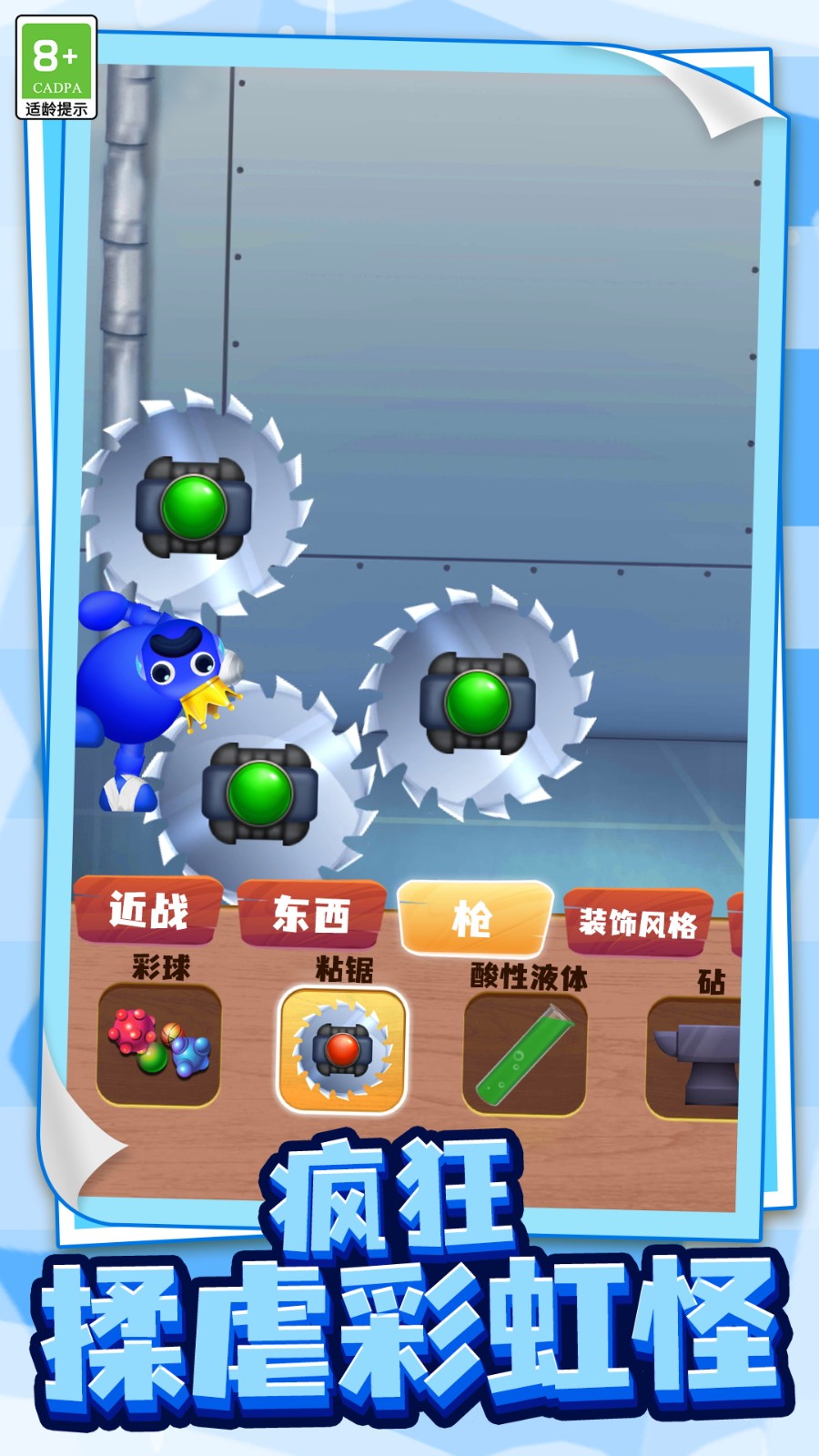 1、选择工具出击:从多种工具中挑选心仪的武器,点击屏幕操控角色,对彩虹怪物发起攻击,感受不同工具带来的打击效果。