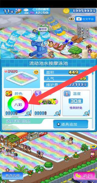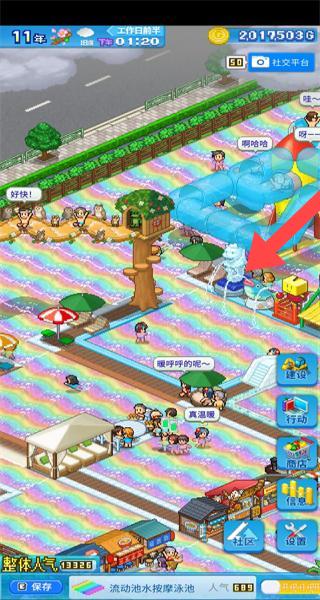 3、社交互动经营:借助社交平台与客人成为好友,根据客人愿望建造设施、调配池水,赠送游泳圈和泳衣,增加客人满意度,提升乐园人气。