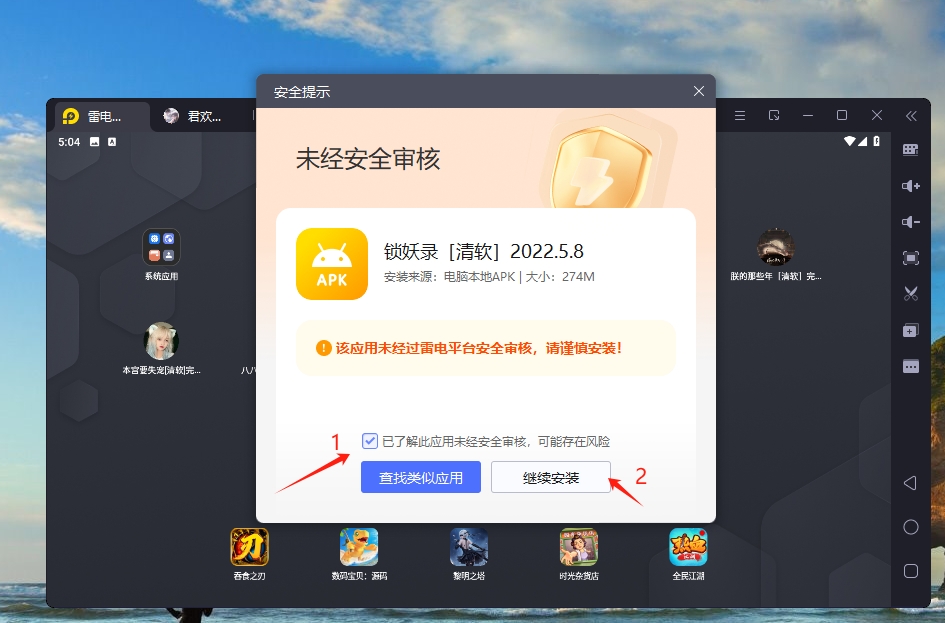 1、将下载好的安装包拖入到雷电模拟器,点击已了解此应用未经安全需要审核,可能存在风险的框框,再点击继续安装。