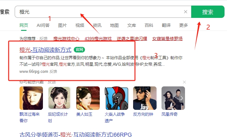 1、在浏览器地址栏中输入搜索引擎网址,打开页面后输入关键词橙光,从搜索结果中找到官网链接并仔细核对,确认无误后点击进入该网站。
