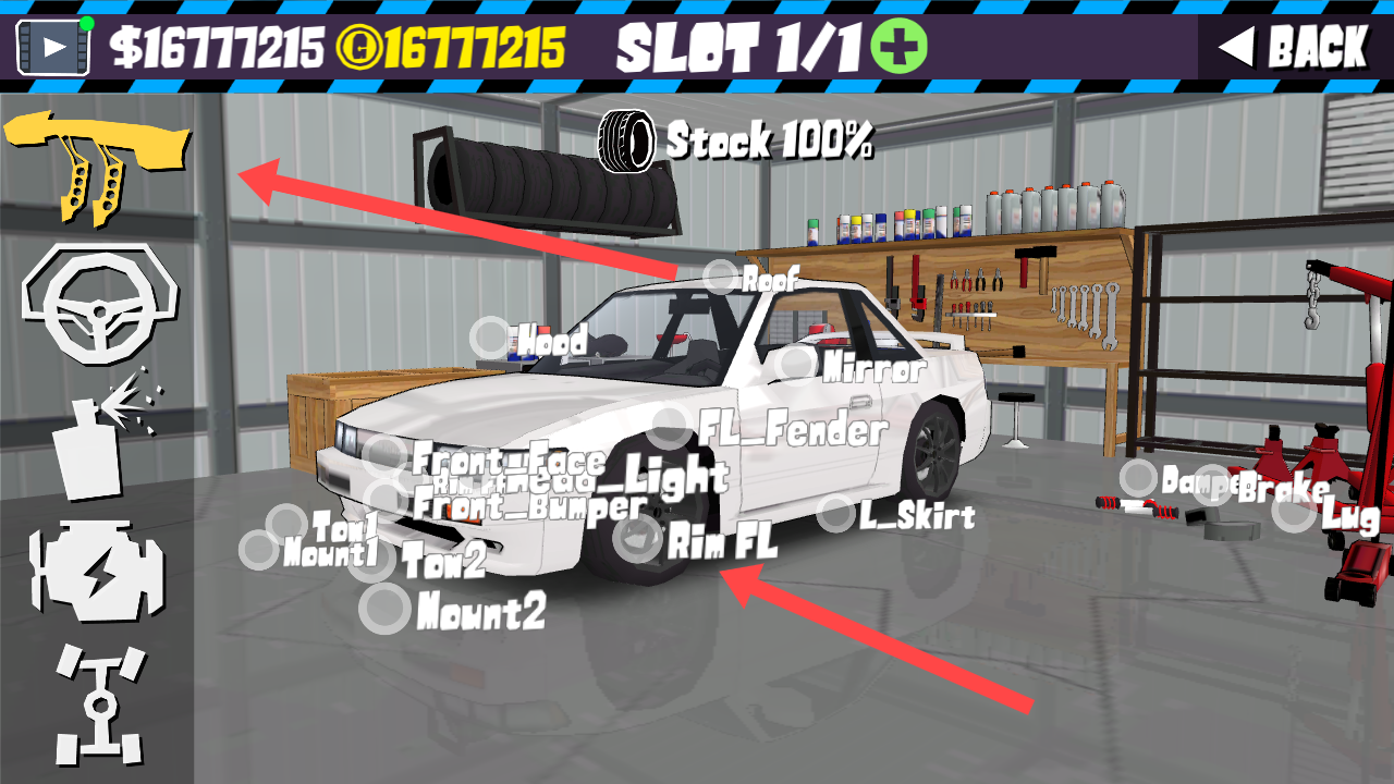 3、你会发现左侧有各种汽车配件,选择你想要改装的部分,然后点击车上的位置就可以完成改装。