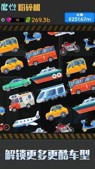 魔性粉碎机是一款极具解压属性的粉碎类作品,用户在游玩中操作面前的粉碎机,将上百款大小、颜色各异的车辆进行粉碎,通过粉碎获取金钱升级粉碎机,享受畅快淋漓的发泄体验,赚取收益的过程中,你可以沉浸于解压的游玩氛围,收获轻松与快乐。