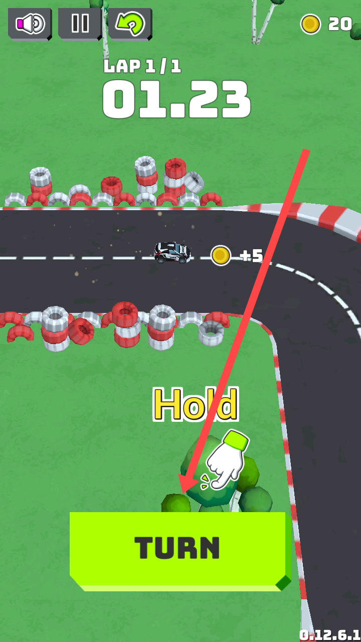 2、进入游戏后是示例教学,按住下方的TURN按钮可以让车辆在行进中漂移转弯。
