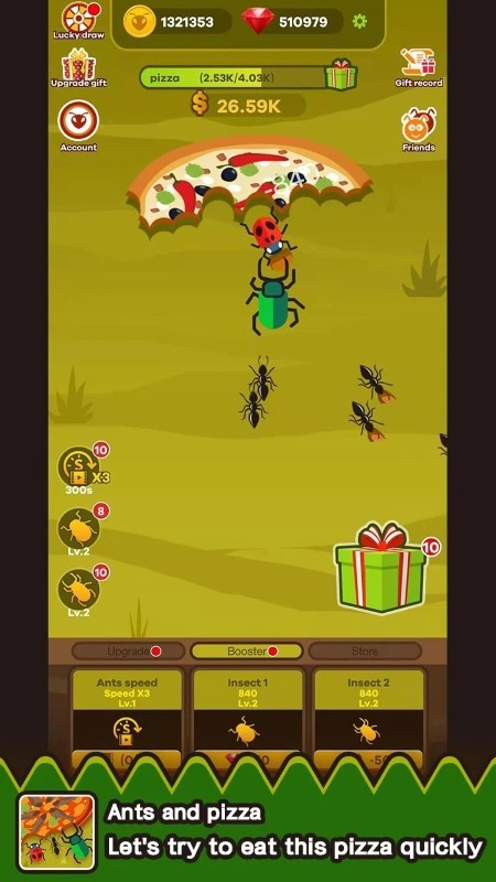 3、将收集到的披萨带回蚁巢,完成资源积累,解锁新的蚁群能力和游戏内容,能够打开礼盒。