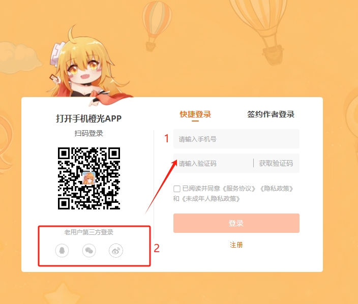 2、打开橙光APP后,通过手机号快捷登录或注册账号,同意协议后即可解锁完整功能,随时随地畅玩互动故事。