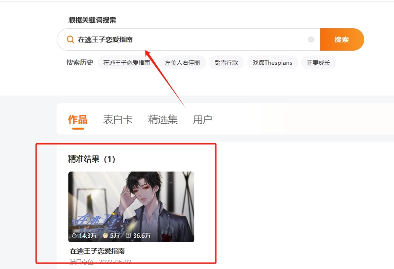 3、在橙光平台输入关键词如在逃王子恋爱指南,可查看作品热度、更新日期及简介,点击进入即可开始互动阅读体验。