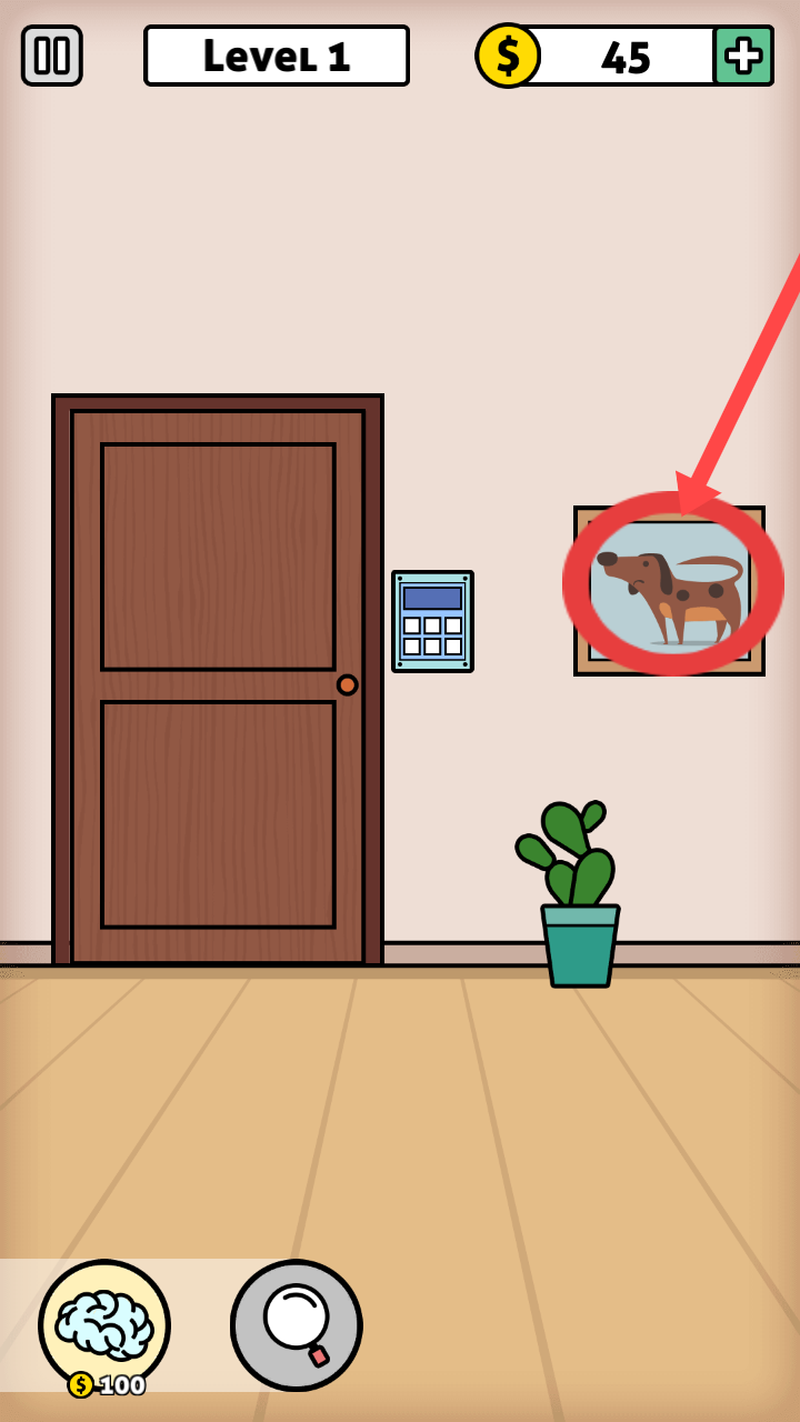3、没有头绪的时候可以点击提示,根据箭头指引,点击墙上带有狗图案的画,这是推进关卡的关键步骤。