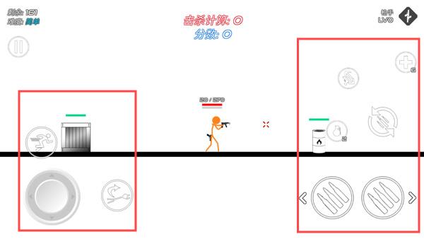 3、进入游戏后,通过左下角的移动按钮和动作按钮控制火柴人移动,右侧按钮进行射击、换弹等操作,体验战斗乐趣。