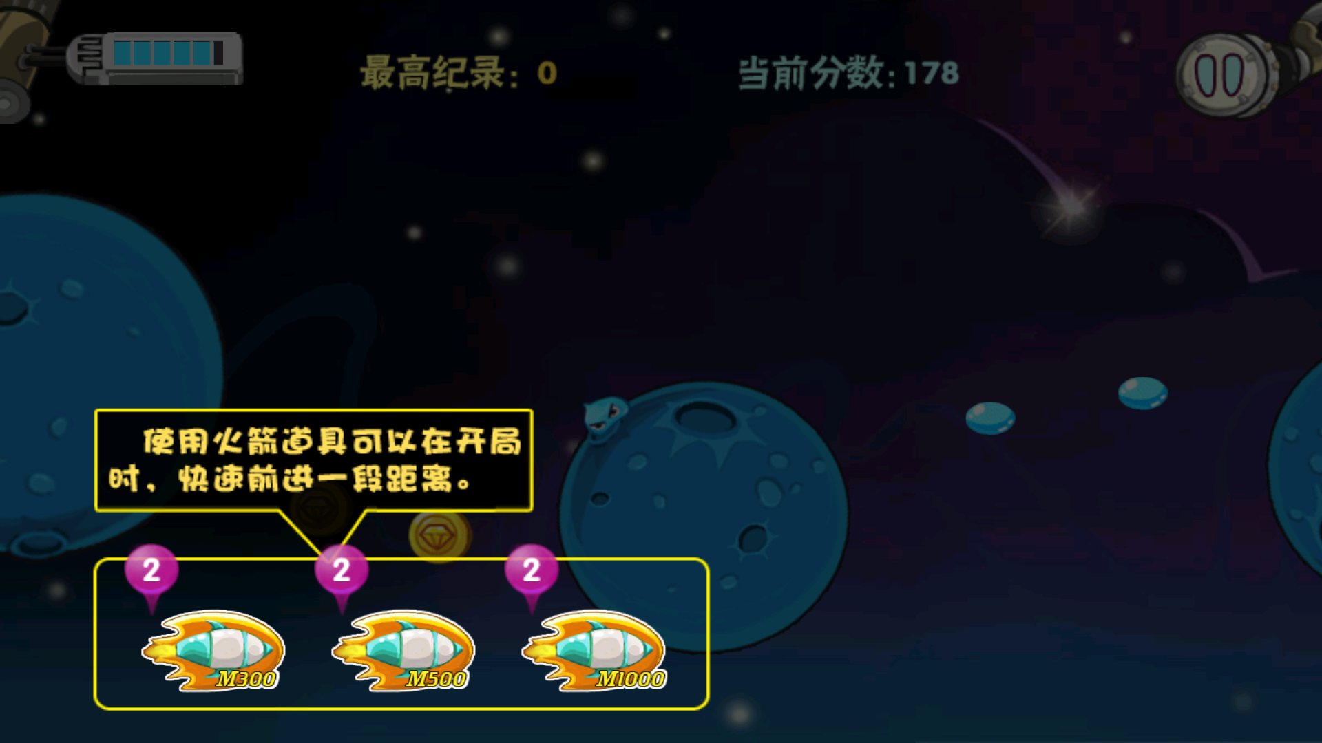 3、过程中还可以使用火箭道具,可以快速前进一段距离,获得更高的分数。