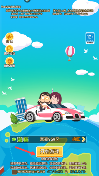 1、在游戏启动界面,点击下方黄色【开始游戏】按钮,进入【富豪959区】,开启游戏之旅。