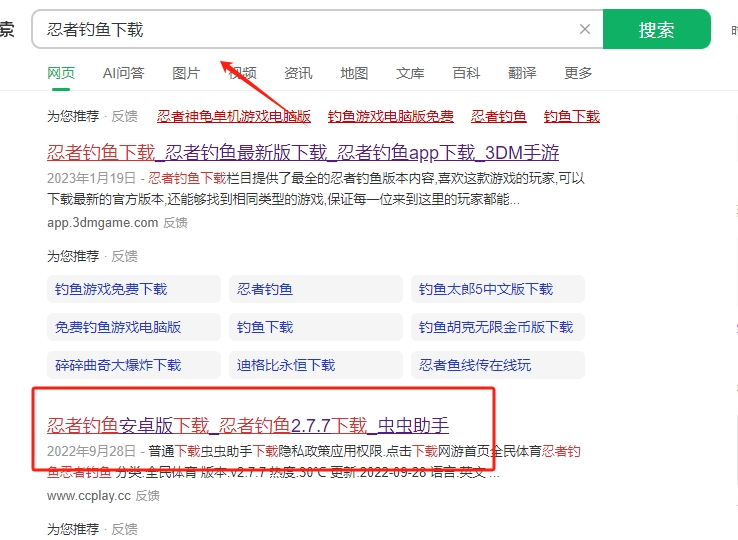 1、在网站上搜索忍者钓鱼下载,点开图示标记的链接进入到游戏网站。