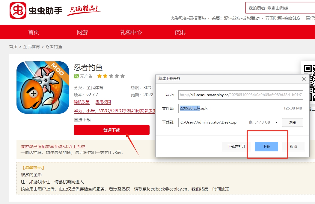 2、进入到游戏网站后,点击普通下载,在弹出的画面下面选择下载,即可下载到桌面。