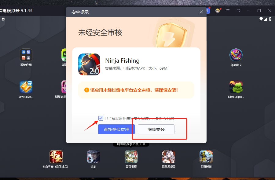 3、将下载好的apk拖入到雷电模拟器,点击已了解此应用,再点击继续安装,即可点开游戏。