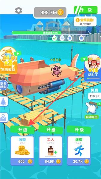 1、进入游戏界面后,点击【升级】按钮提升收益等级,增加金币获取,这是积累财富的关键操作。