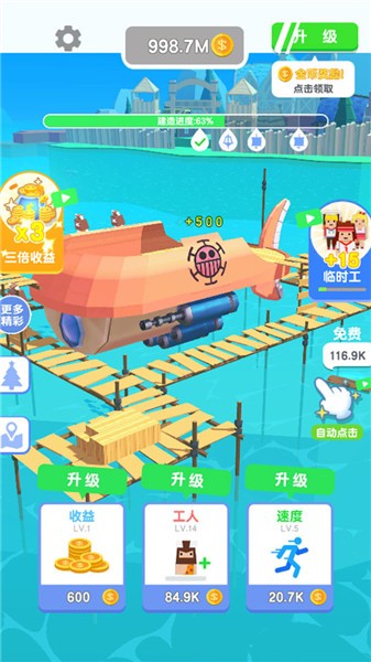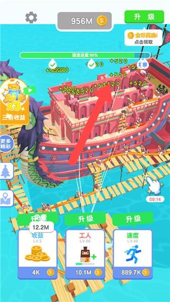 1、任务驱动建造机制:设置材料收集、船只升级、海盗战斗等多元任务,完成即可获取奖励解锁新造船图纸与高级装饰道具。