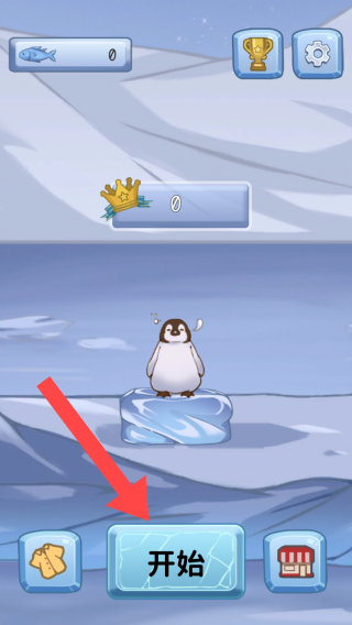 1、画面中可以看到一只企鹅站在冰块上,点击【开始】进入游戏,左下角是服装图标,用于更换企鹅皮肤。