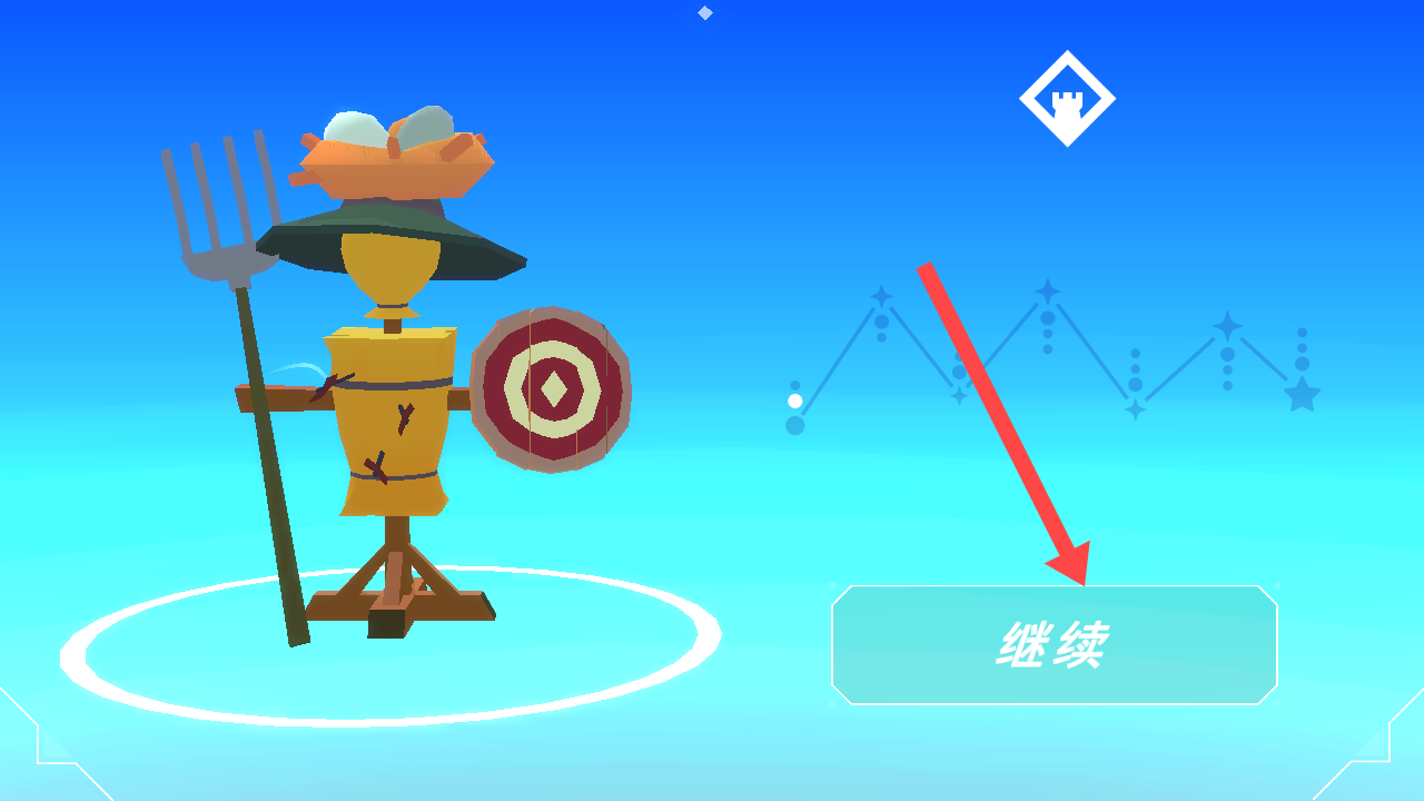 3、出现稻草人特写界面后,点击【继续】按钮,持续进行游戏体验,进入下一关。