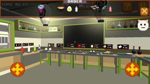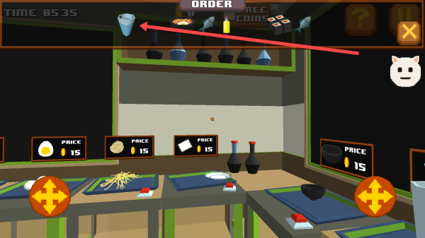 3、出现【ORDER】订单提示时,按提示从上方选取对应物品(如杯子等),开始制作料理,满足顾客需求以获取收益。