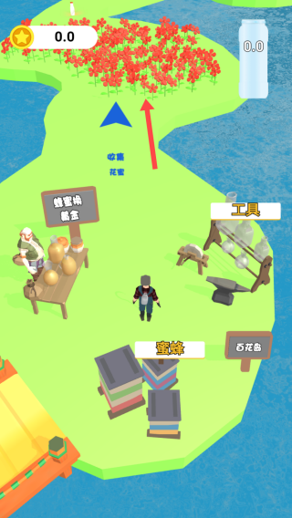 2、在有大量花朵的区域,跟随【箭头】指引前往采集蜂蜜,收集足够资源用于后续兑换和经营。