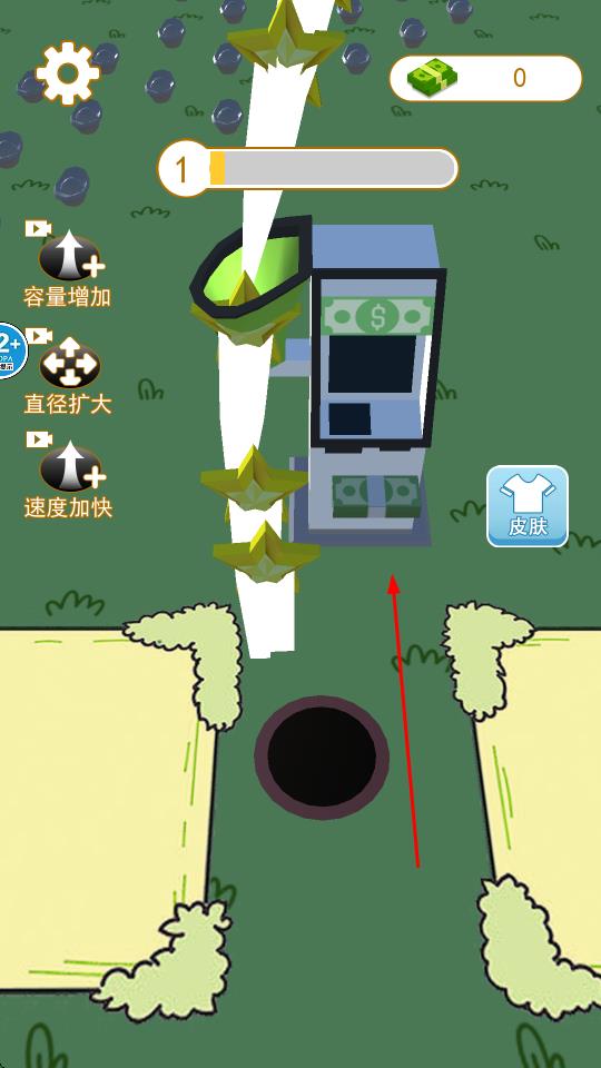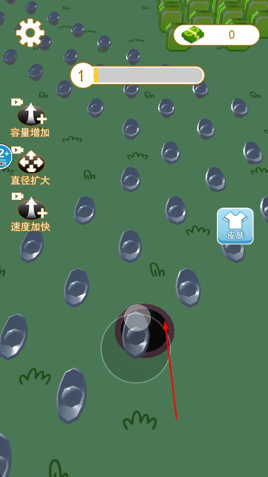 1、点击屏幕开始游戏,按住摇杆拖动使黑洞移动,当物体在黑洞上面,黑洞将其吸入,加入到库存。