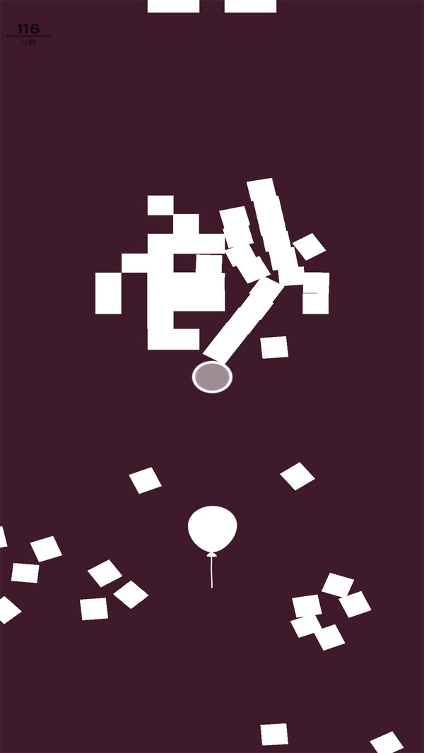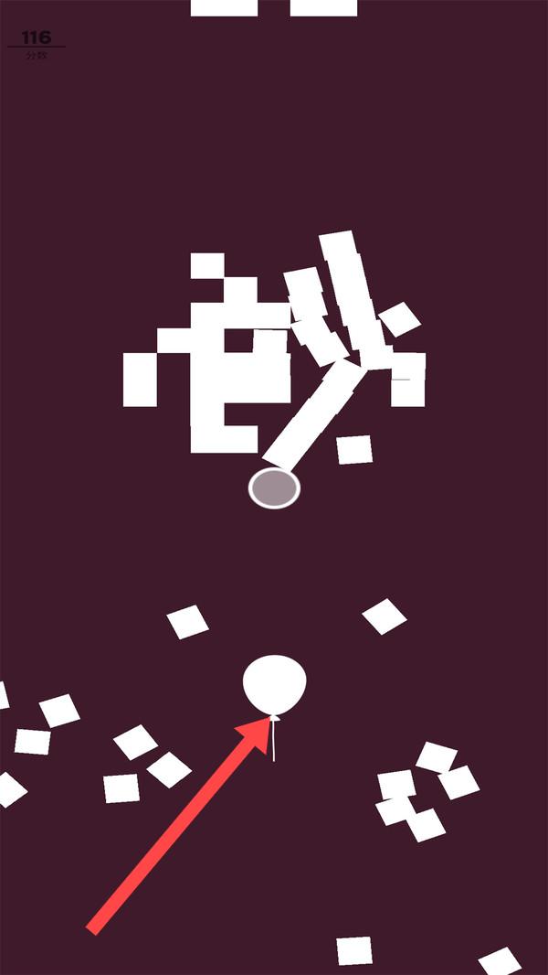 1、操控白色气球,按照箭头方向移动,在深色背景里躲避散落的白色方块,以此积累分数直至达到116。