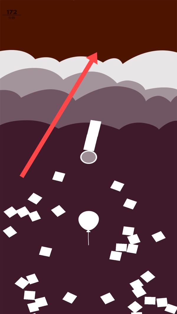 2、持续让气球向上移动,就像箭头所指示的那样,穿越带有感叹号标志的区域,使分数提升至172,从而持续进行挑战。