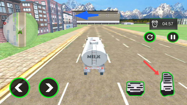 1、进入驾驶环节,熟悉屏幕下方【箭头】指示的操控按键,如左右转向、刹车和油门,在规定时间【04:57】内安全驾驶牛奶运输车辆。