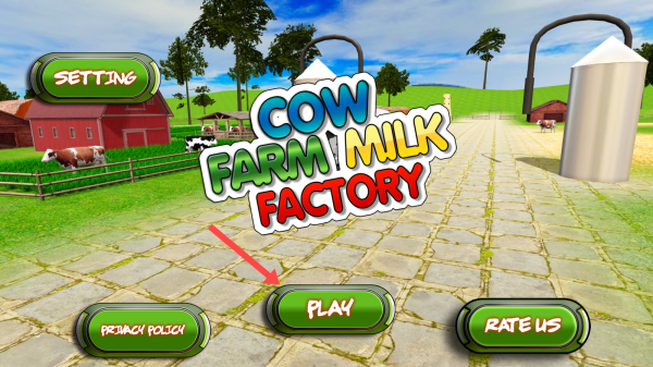 2、游戏开始界面,点击【箭头】所指的【PLAY】按钮,正式开启《COWFARMMILKFACTORY》游戏之旅。