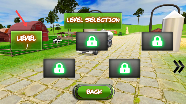 3、在关卡选择界面,点击【箭头】指向的【LEVEL1】按钮,解锁并进入第一关,逐步推进游戏进程。