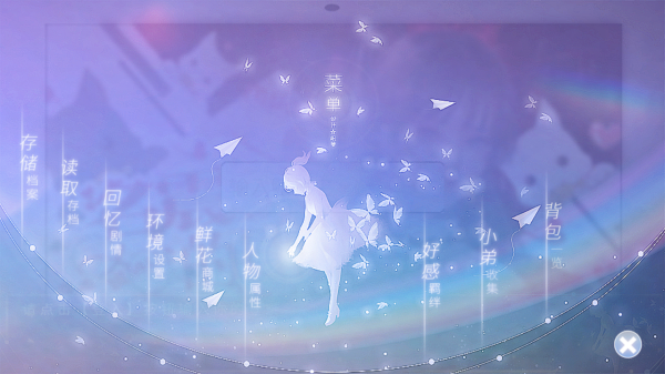 3、游戏菜单包含【背包一览】【好感羁绊】【鲜花商城】【存储档案】等功能,可管理背包、查看角色关系、购买道具、保存读取进度。