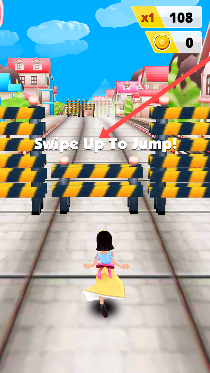 2、游戏行进中,当角色遇障碍时可以按【SwipeUpToJump】提示,向上滑动屏幕实现跳跃。