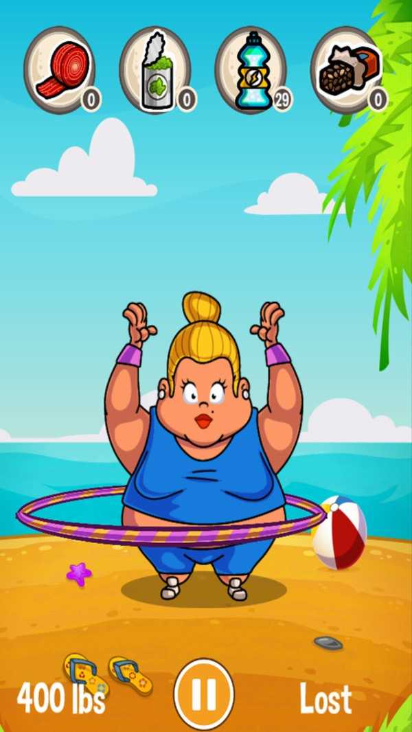 2、在海边场景中,操控角色转呼啦圈,注意下方的【400 lbs】体重数值,合理利用上方的【饮料瓶】辅助锻炼。