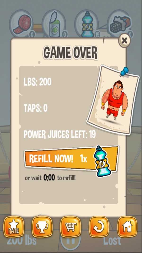 3、查看【LBS:200】体重结果,若【POWER JUICES LEFT】不足,点击【REFILL NOW!】补充能量等待时间恢复。