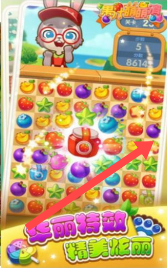2、按照箭头指示方向,有策略地消除水果,为后续操作创造条件,推进关卡进程。