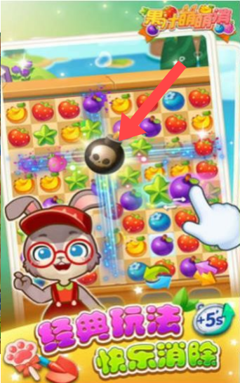 3、利用特殊道具(如黑色炸弹),点击释放消除大片水果,快速完成关卡目标,享受快乐消除体验。