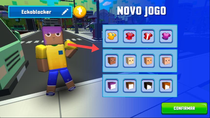 2、“NOVO JOGO”界面中,选择角色的服装、头部等外观,点击【CONFIRMAR】确认,打造个性角色。