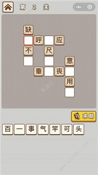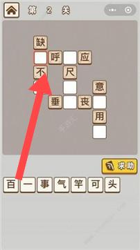 2、在答题关卡中,观察题目布局,拖动下方字块填入正确位置,如第2关按提示将合适字填入空缺处,完成填字任务。