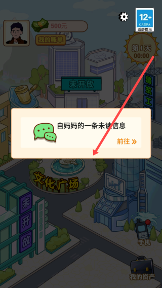 1、进入游戏界面,看到“自妈妈的一条未读信息”提示,点击【前往】查看信息,开启游戏初期互动。