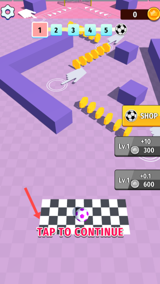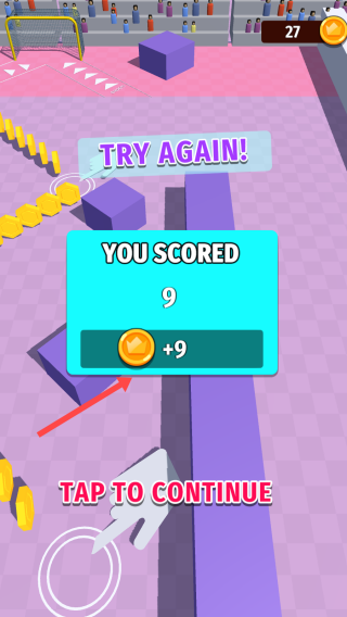 3、进球得分后,点击【箭头】所指的金币奖励区域领取金币,然后点击【TAPTOCONTINUE】继续下一轮游戏。