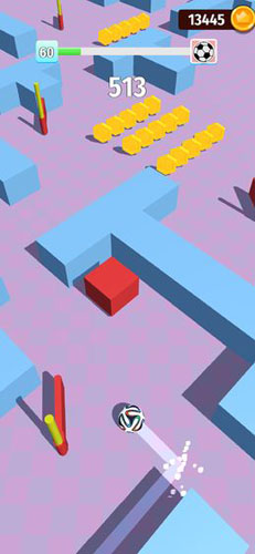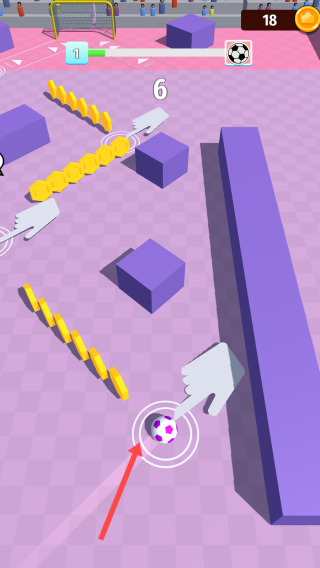 2、游戏中跟随【箭头】所指方向滑动屏幕,操控足球收集金币,避开紫色方块等障碍,向球门推进。