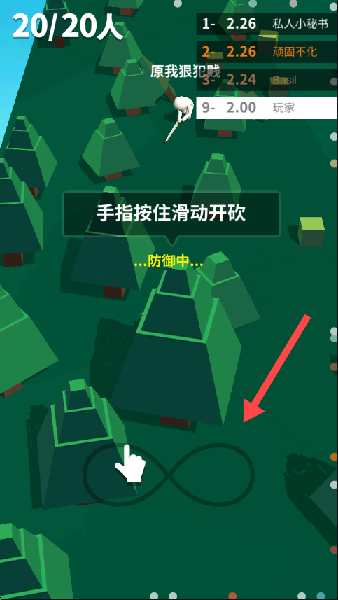 2、游戏里按【手指按住滑动开砍】提示操作,操控角色攻击,同时关注玩家排名和剩余人数。