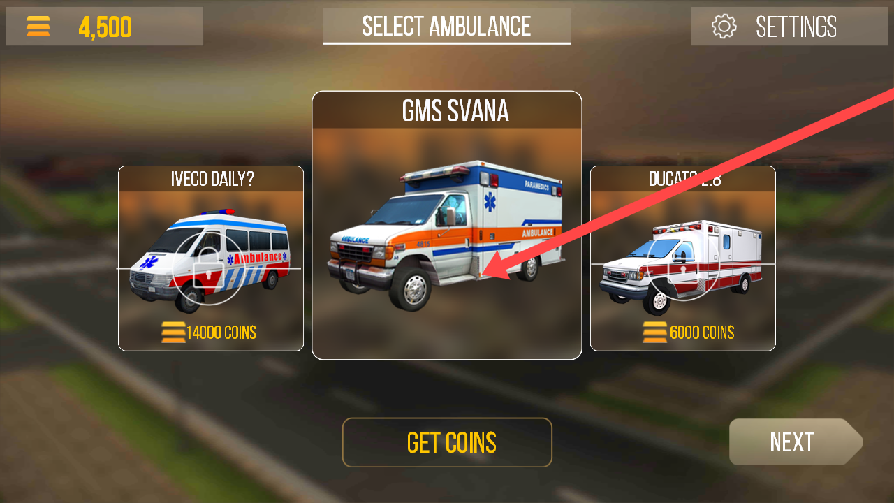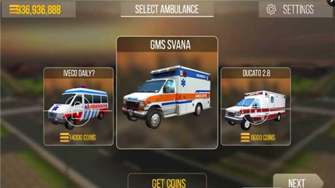 1、进入救护车选择界面,确认选中GMSSVANA救护车后,点击【NEXT】按钮。