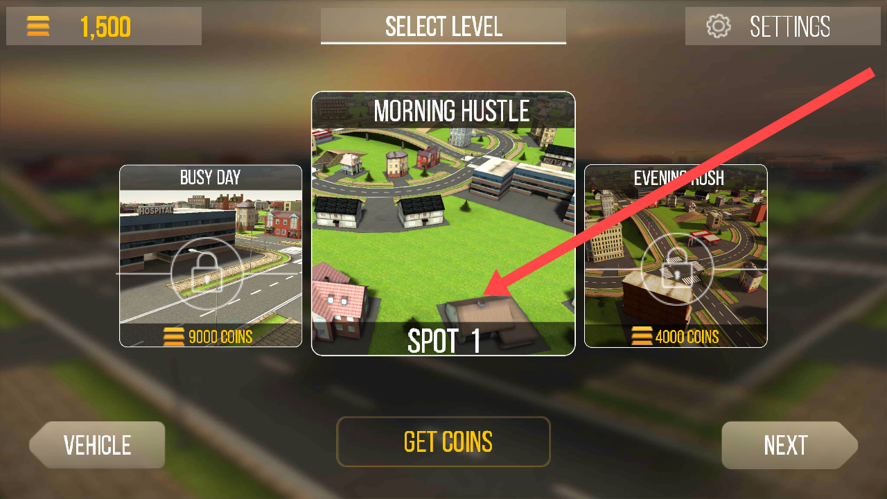 2、在关卡选择界面,点击【MORNINGHUSTLE】关卡的【SPOT1】,开始体验救护车驾驶任务。