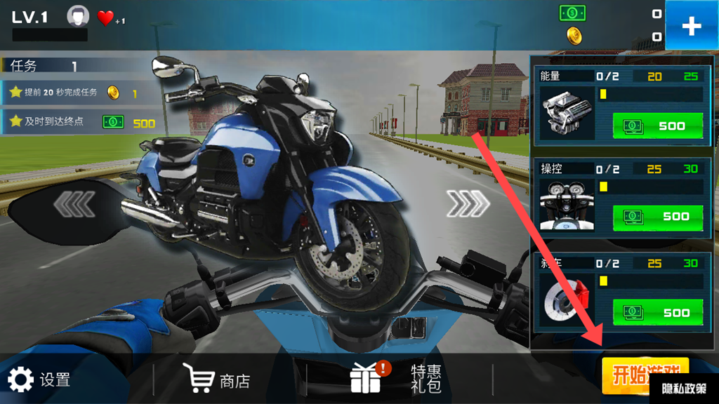 1、点击进入游戏后可以现在左下角设置各项参数,商店购买所需道具,更有特惠礼包赠送各种福利,准备好以后点击开始游戏。