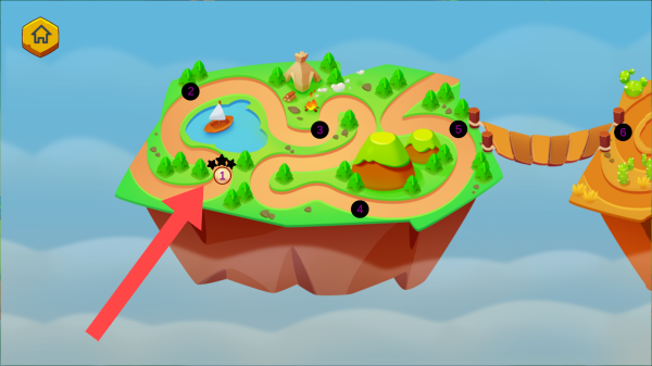 2、画面展示了一个悬浮在空中的岛屿地图,岛上有蘑菇状建筑等元素,路径旁标有数字如 1、3、5 等代表关卡节点。