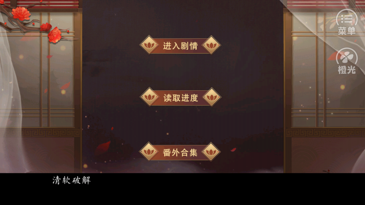 2、第二张图片是游戏开始界面,有【进入剧情】【读取进度】【番外合集】选项,玩家可根据需求选择新剧情、加载存档或查看额外内容。