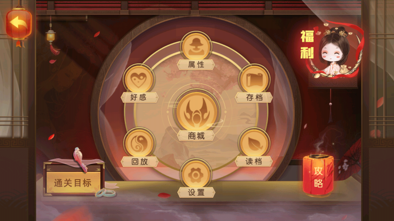 3、第三张图片为游戏菜单界面,包含【属性】【好感】【存档】【商城】【回放】【读档】【设置】等功能,合理使用这些功能可查看角色状态。