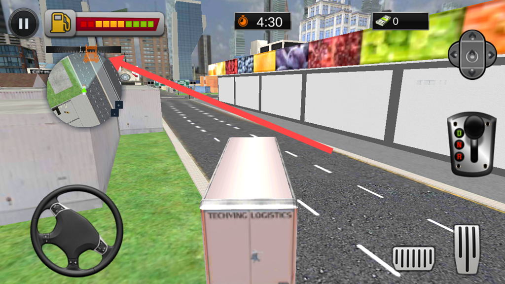 3、注意看左上角的地图图标,橙色的标记即为送货的目的地,如果中途没有油了还需要去加油站加油,此时地图会多一个蓝色的油站标志。