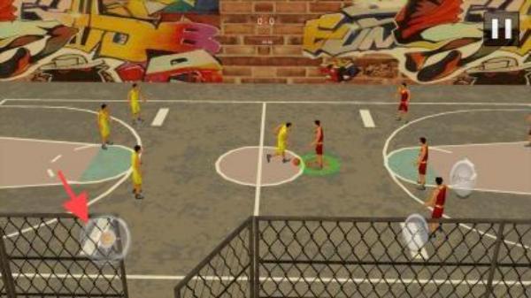1、在篮球游戏中点击【箭头】所指的左侧虚拟摇杆,控制己方球员移动,寻找机会接球或切入进攻。